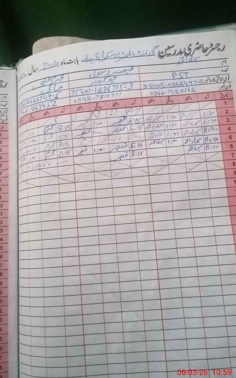 | CNIC | Full Name | Designation | R/C | Absence During Last Calender Month |