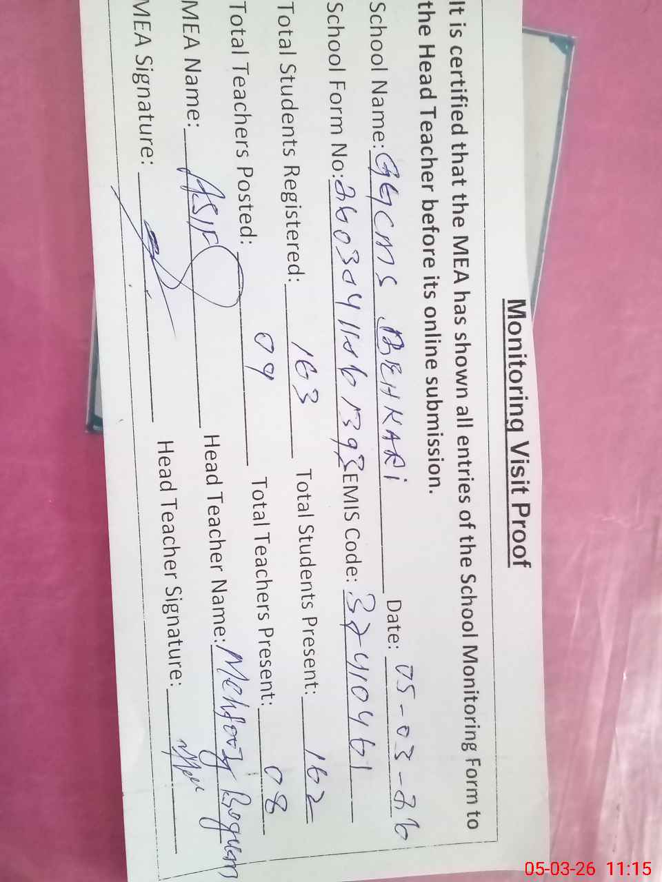 | EMIS Code: 37410461 | Name of School: GGCMS BEHKARI | |||