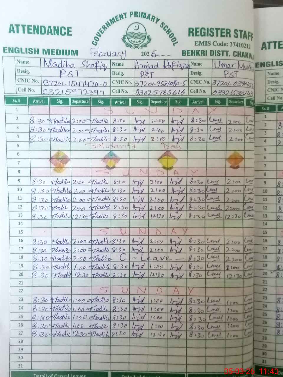 | CNIC | Full Name | Designation | R/C | Absence During Last Calender Month |