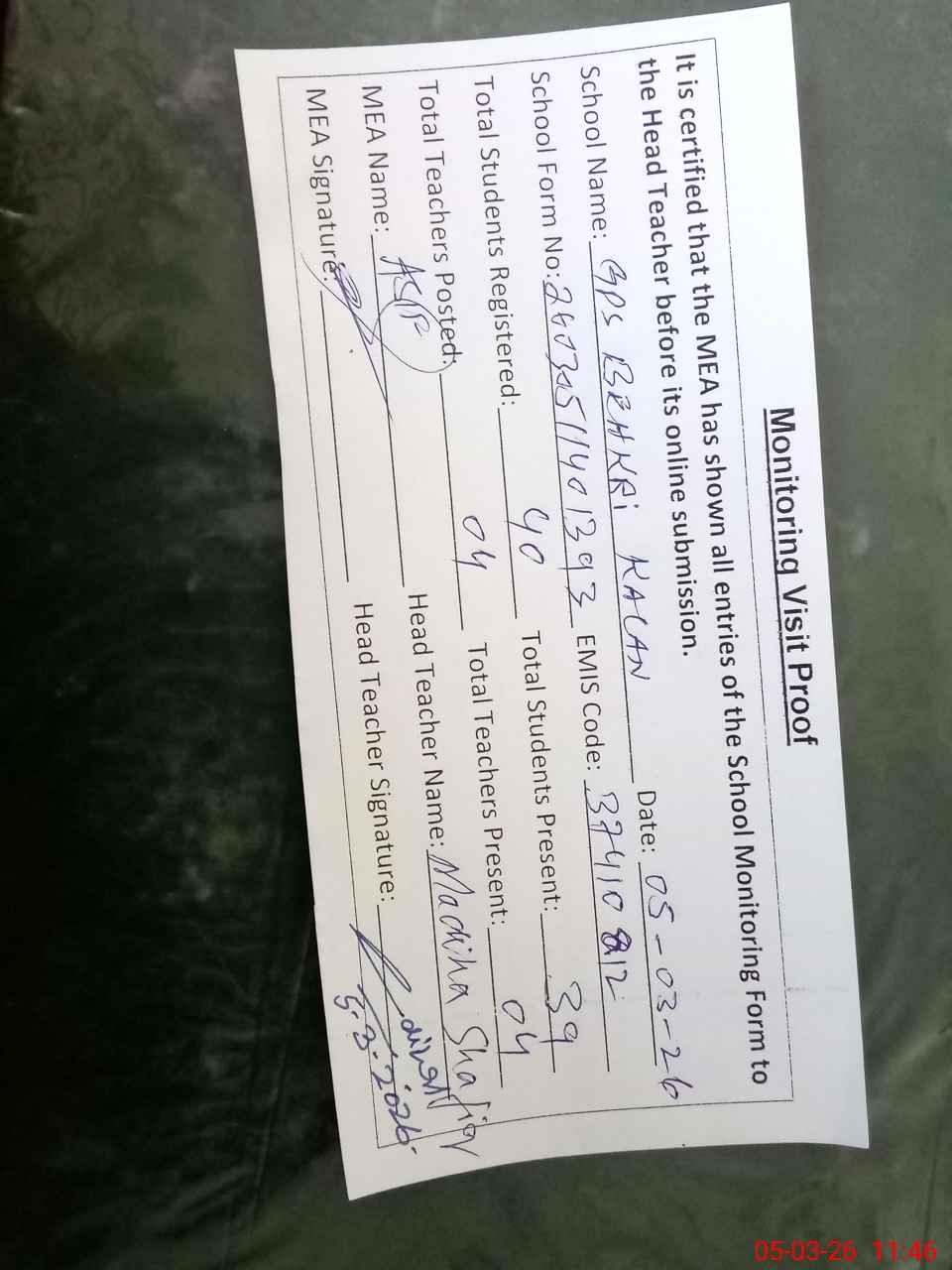 | Attendance Register | Head Teacher | MEA with School | Visit Proof |