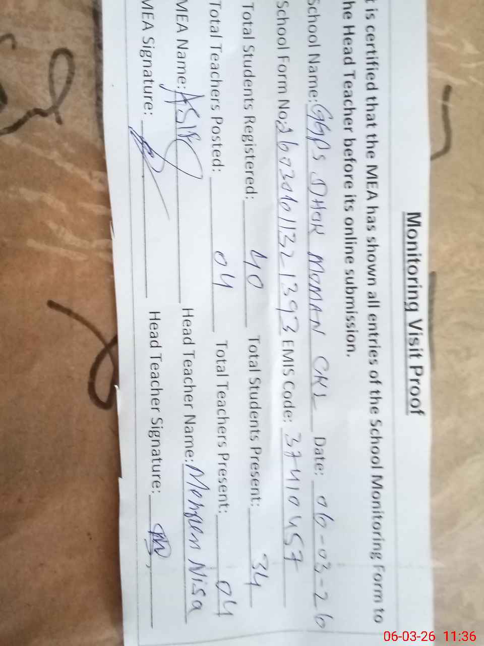 | Attendance Register | Head Teacher | MEA with School | Visit Proof |