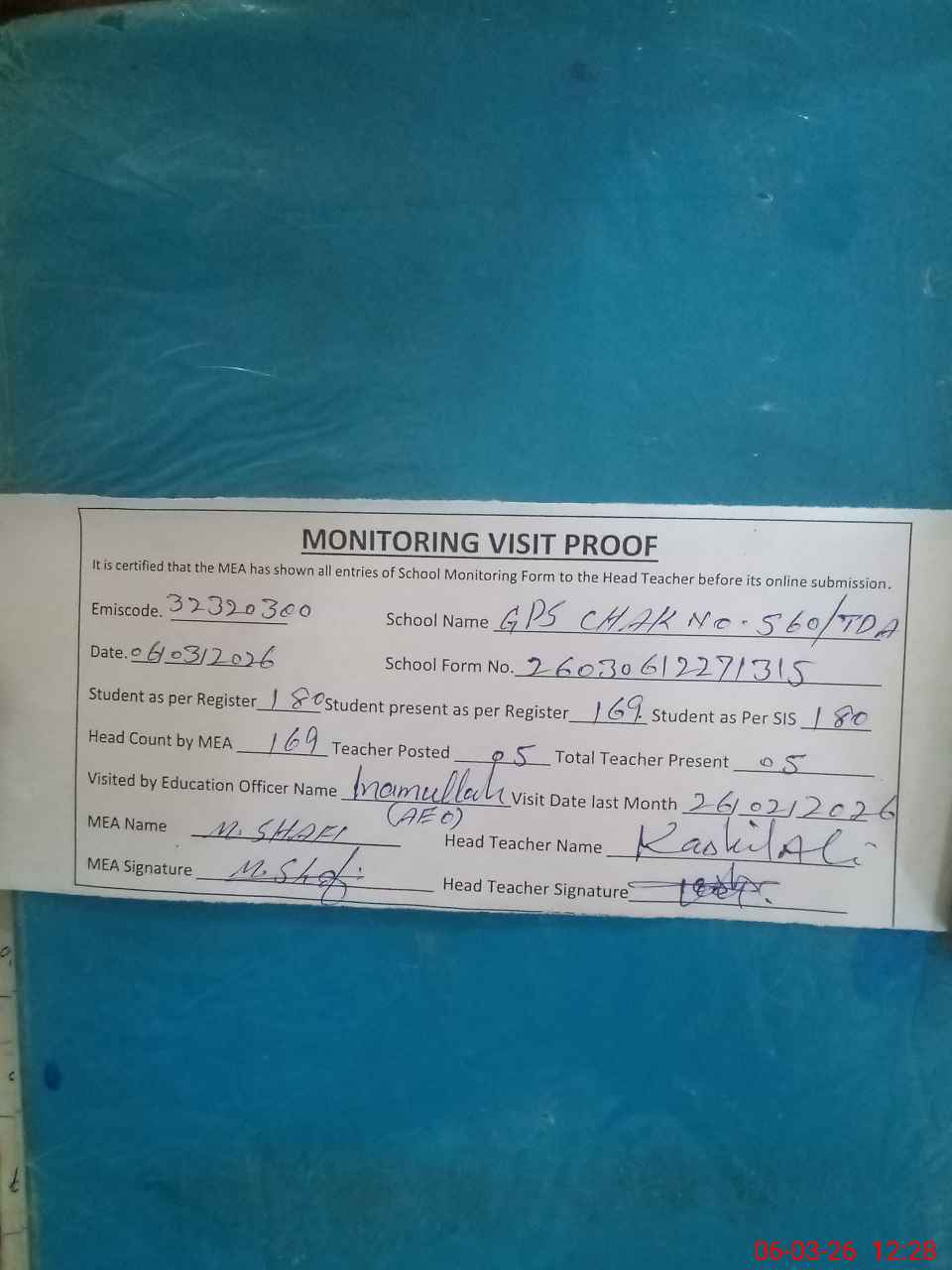 | EMIS Code: 32320300 | Name of School: GPS CHAK NO.560 TDA | |||