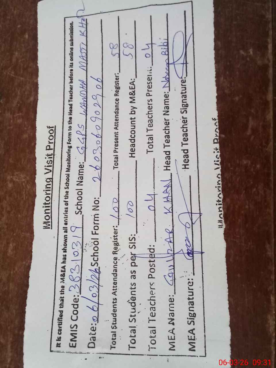 | Attendance Register | Head Teacher | MEA with School | Visit Proof |