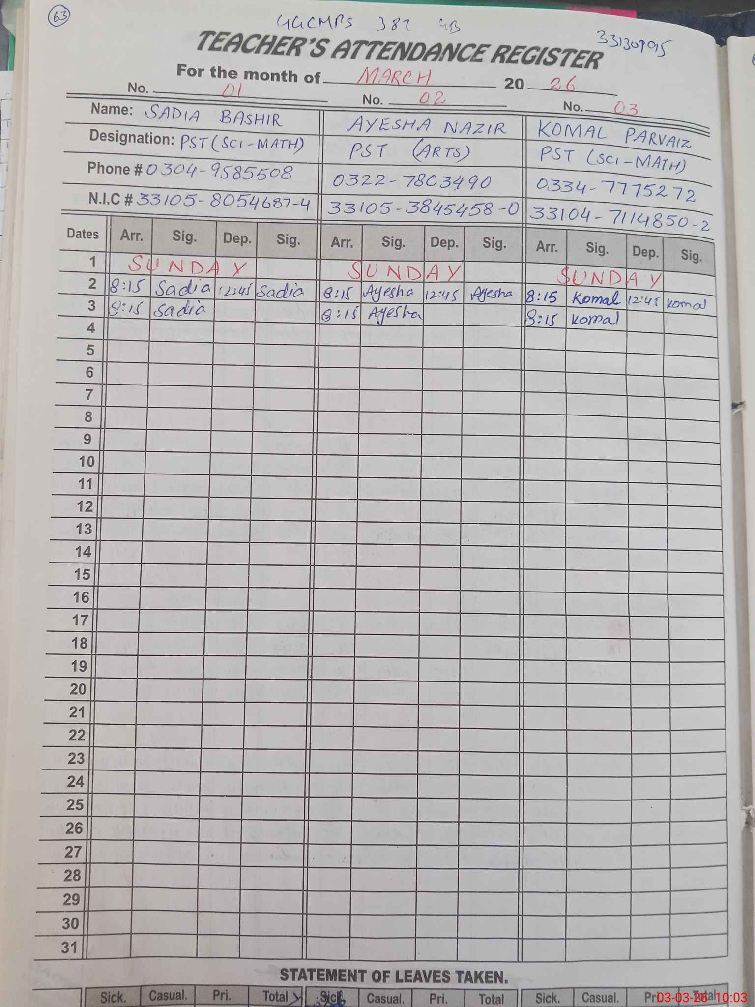 | Name: SA**** BA**** Designation: (School Headmaster's/Headmistress's) PST Phone/Cell Number: 03**** |