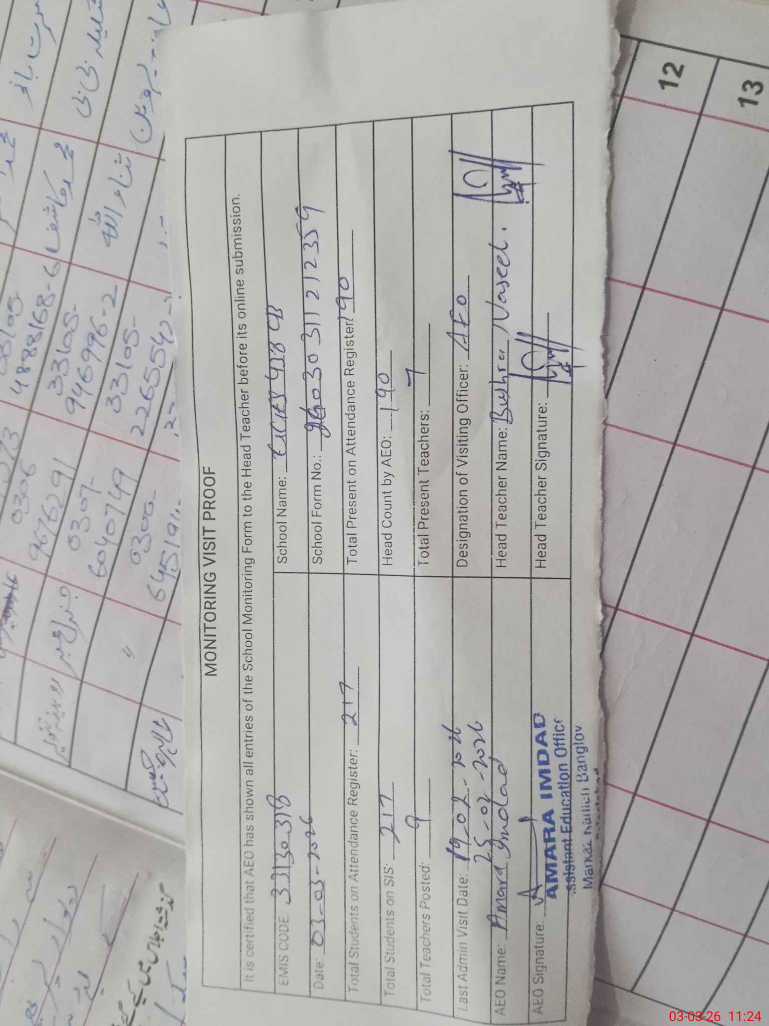 | Attendance Register | Head Teacher | MEA with School | Visit Proof |