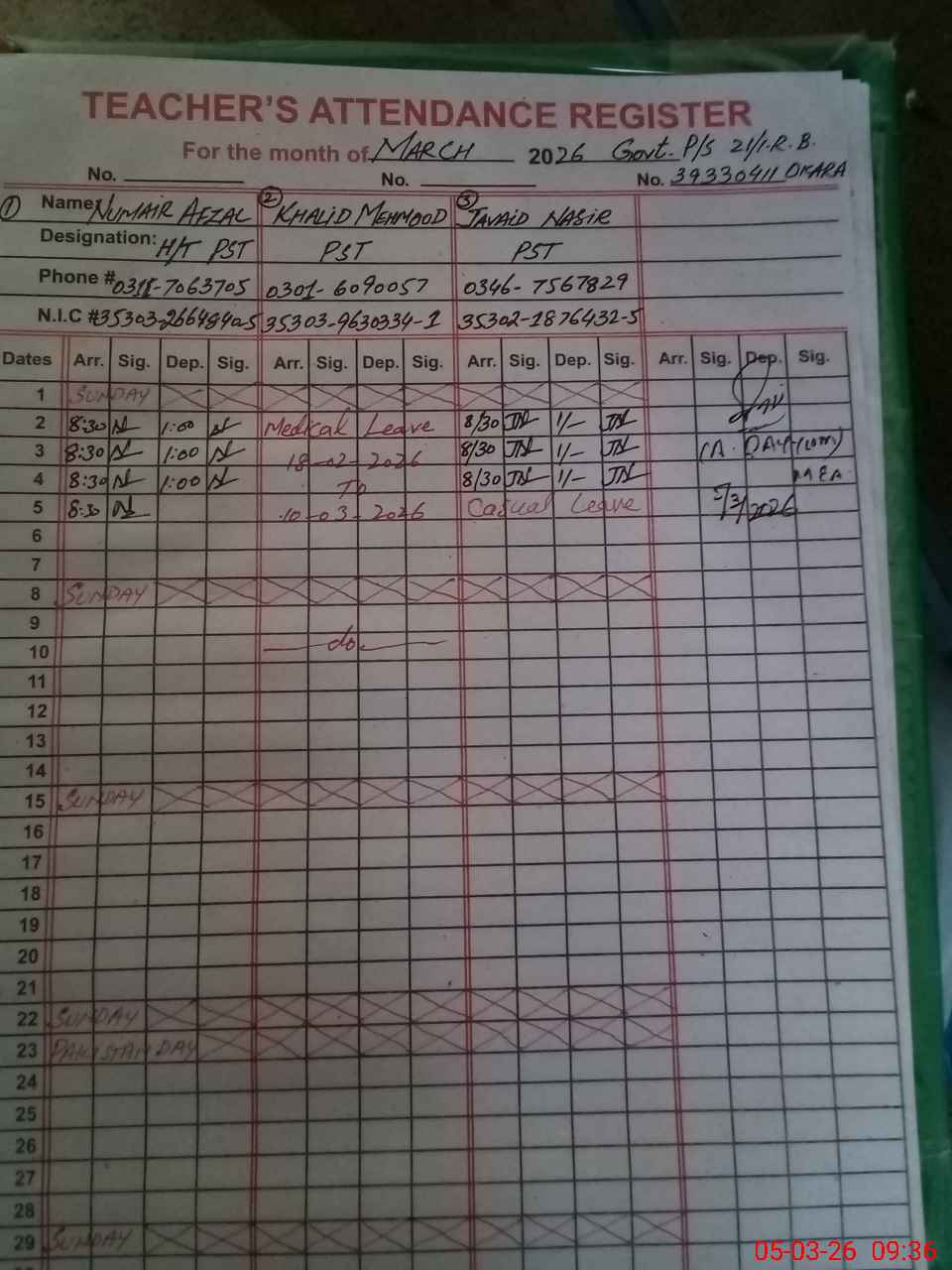 | CNIC | Full Name | Designation | R/C | Absence During Last Calender Month |