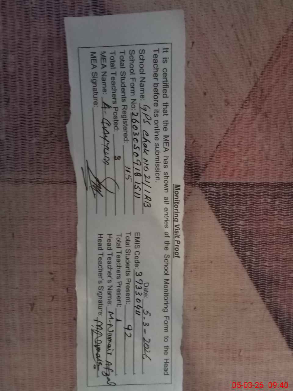 | Attendance Register | Head Teacher | MEA with School | Visit Proof |