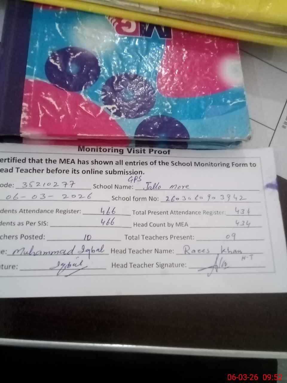 | Attendance Register | Head Teacher | MEA with School | Visit Proof |