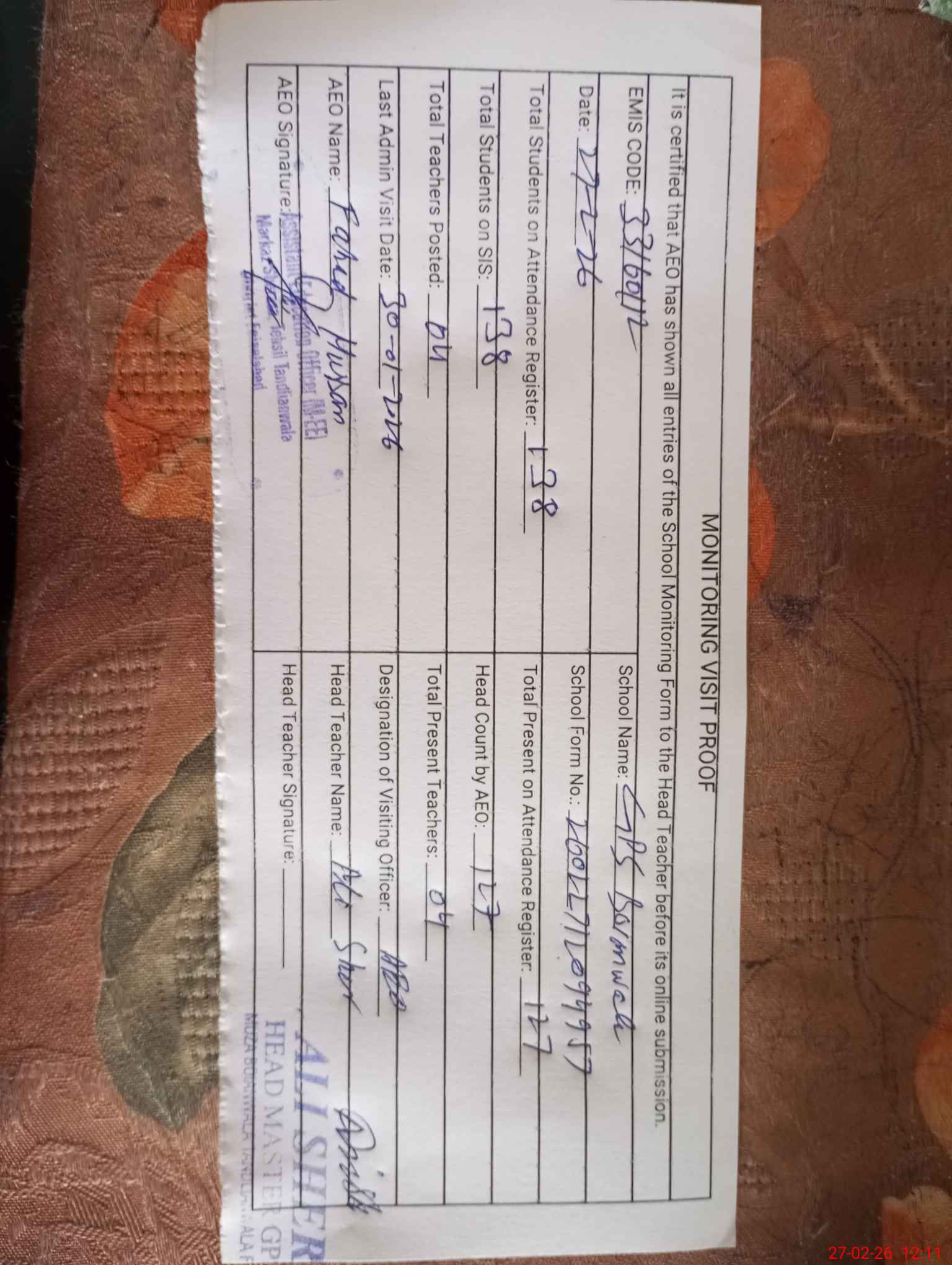 | Attendance Register | Head Teacher | MEA with School | Visit Proof |