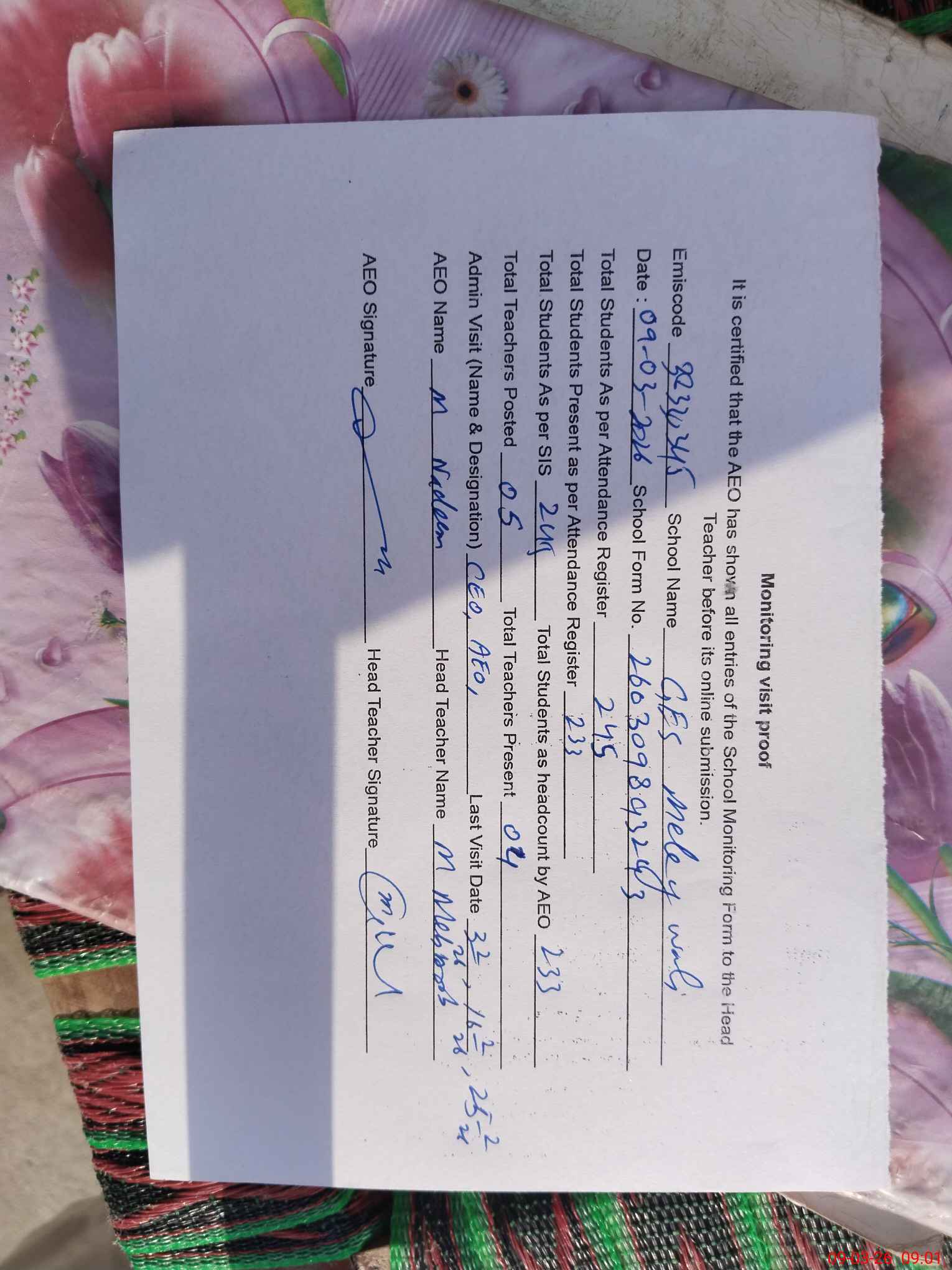 | Certified that this School was Inspected by the Undersigned MEA/DMO Today and the Information Stated Above is as Per Record. | |||||