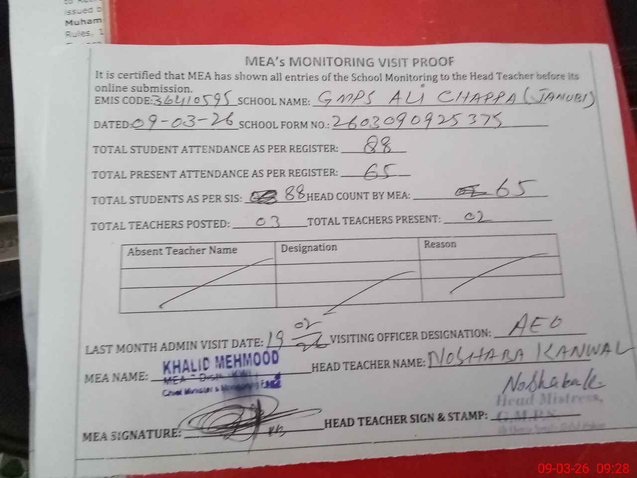 | Attendance Register | Head Teacher | MEA with School | Visit Proof |