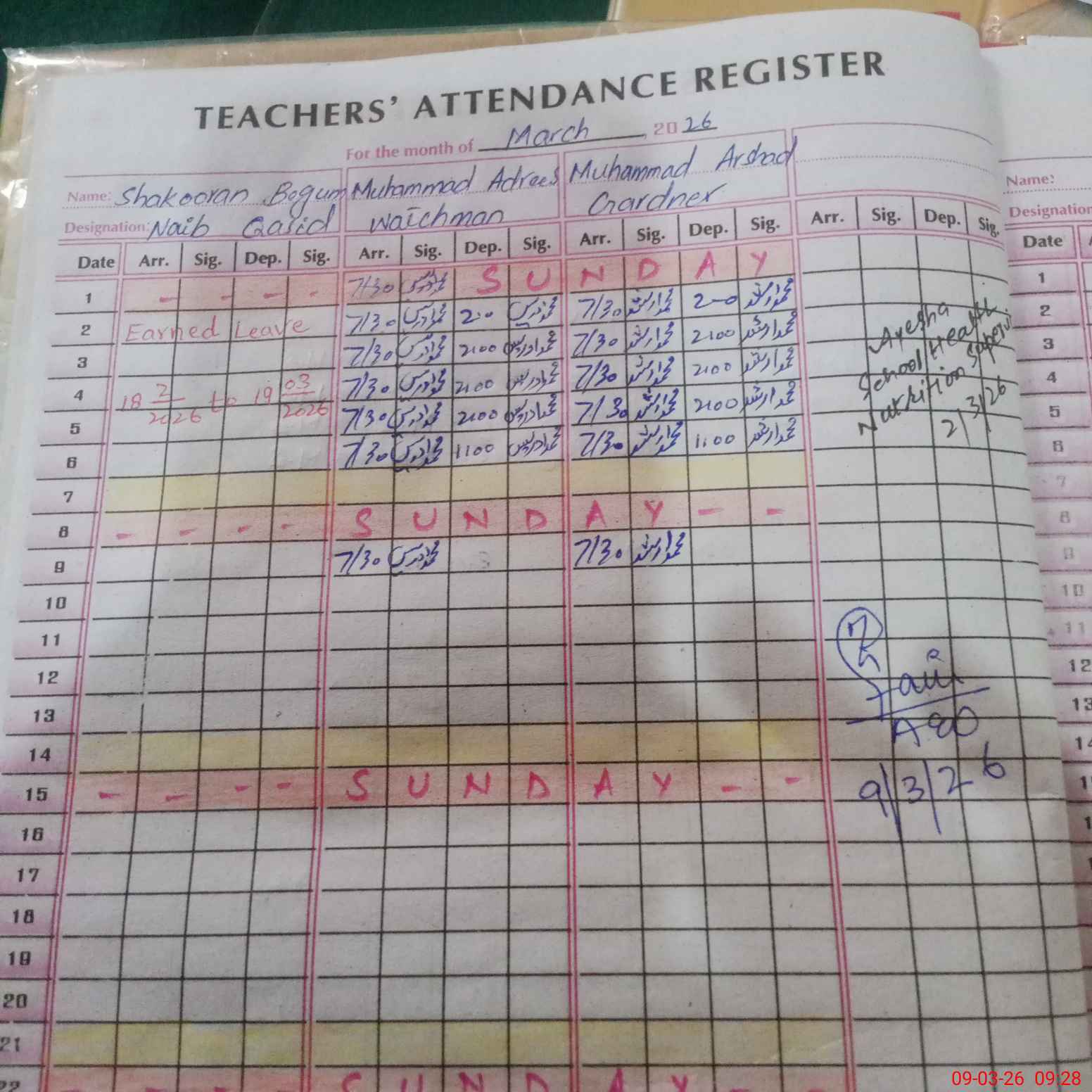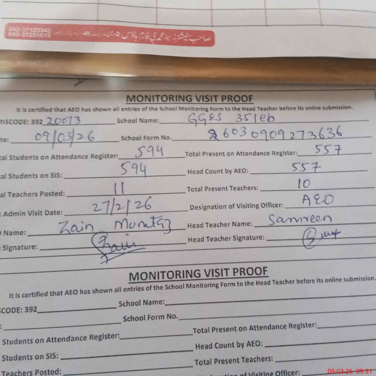| Monitoring Date: 09-03-2026 | Start Time: 09-03-2026 09:07 AM | End Time: 09-03-2026 09:31 AM | Name of MEA: Za**** Mu**** | |