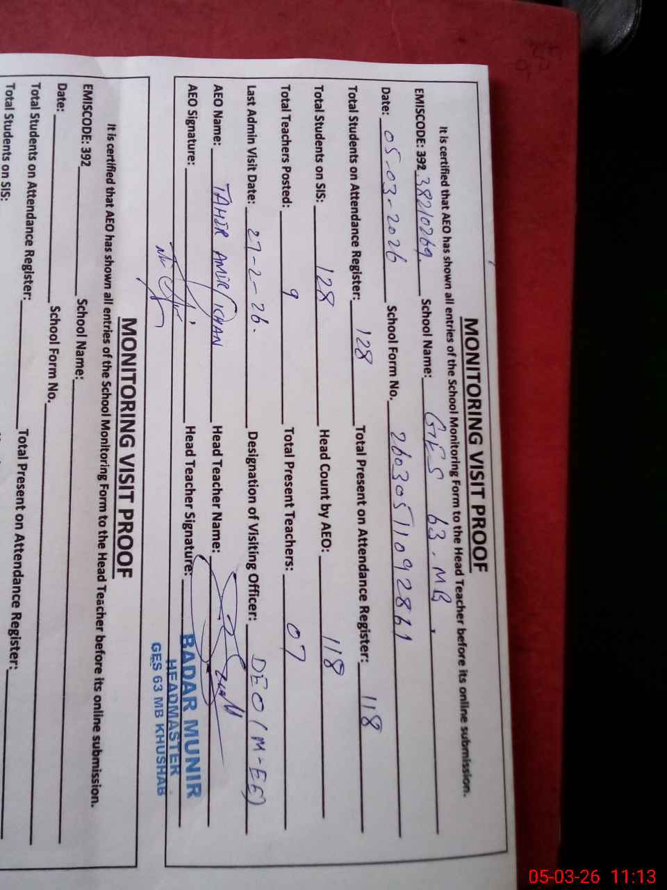 | EMIS Code: 38210269 | Name of School: GES CHAK NO 63 MB | |||