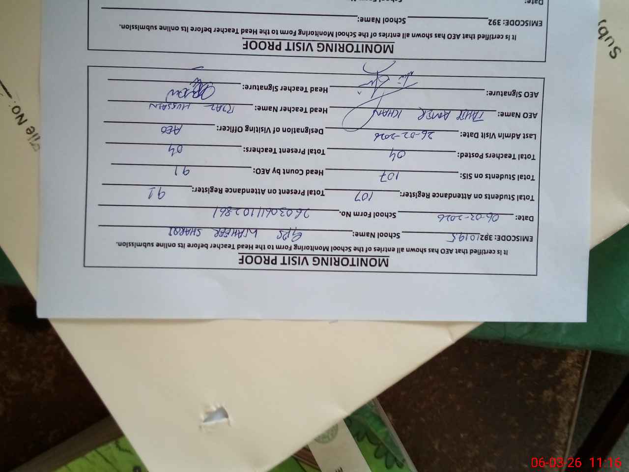 | Certified that this School was Inspected by the Undersigned MEA/DMO Today and the Information Stated Above is as Per Record. | |||||