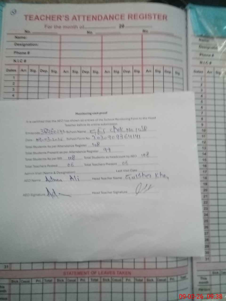 | Attendance Register | Head Teacher | MEA with School | Visit Proof |