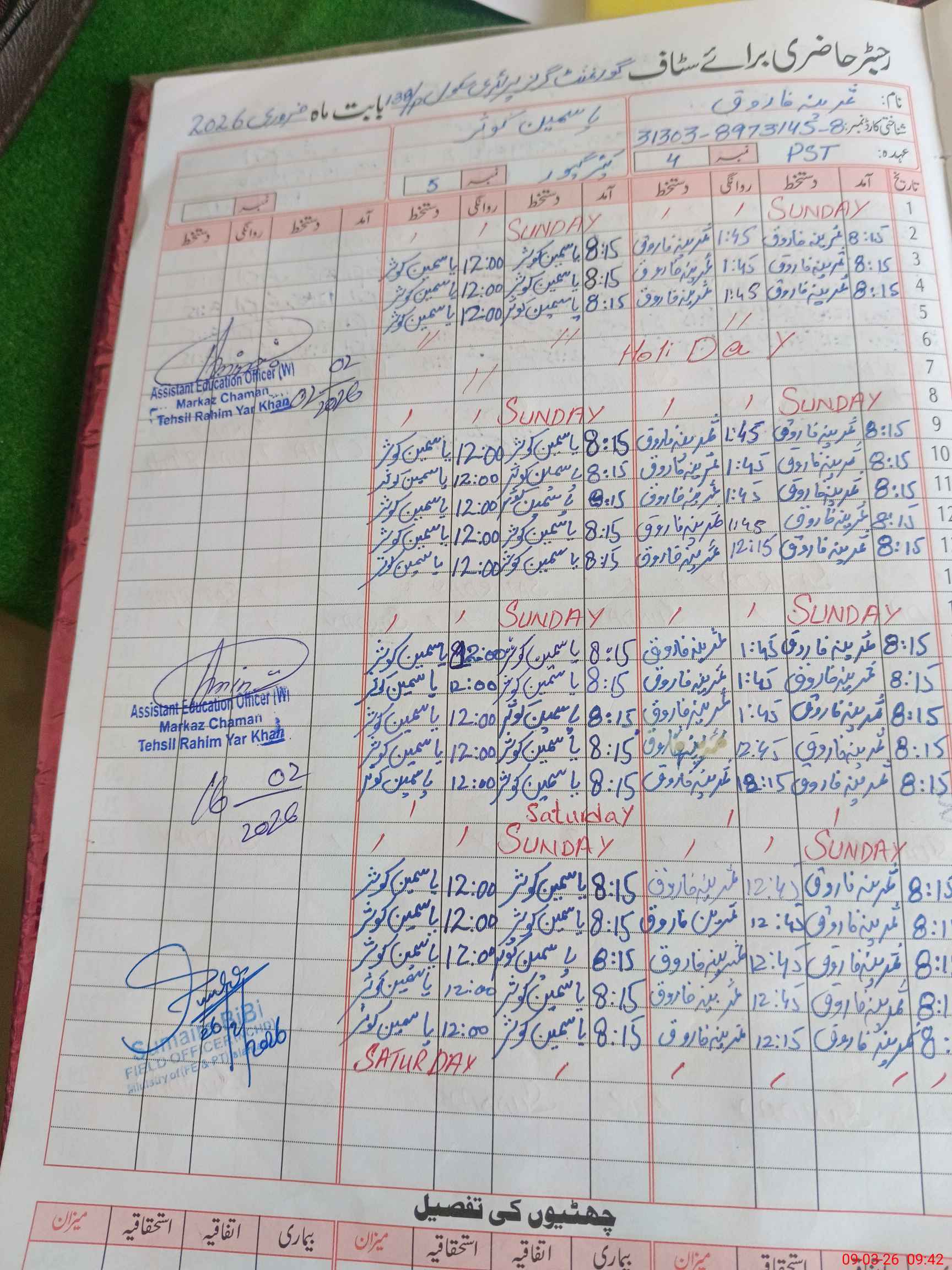 | Name: IR**** RA**** Designation: (School Headmaster's/Headmistress's) PST (SCI-MATH) Phone/Cell Number: 03**** |