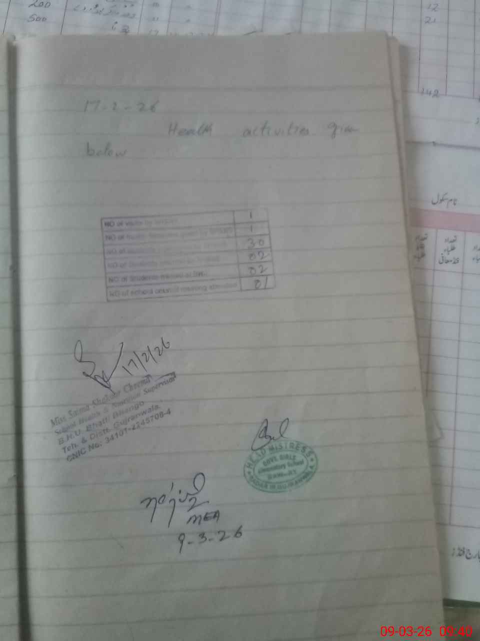 | School Visited by School Health & Nutrition Supervisor (No. of Visits) | 1 | Name1: | SAIMA SHAKOOR | Name2: | |