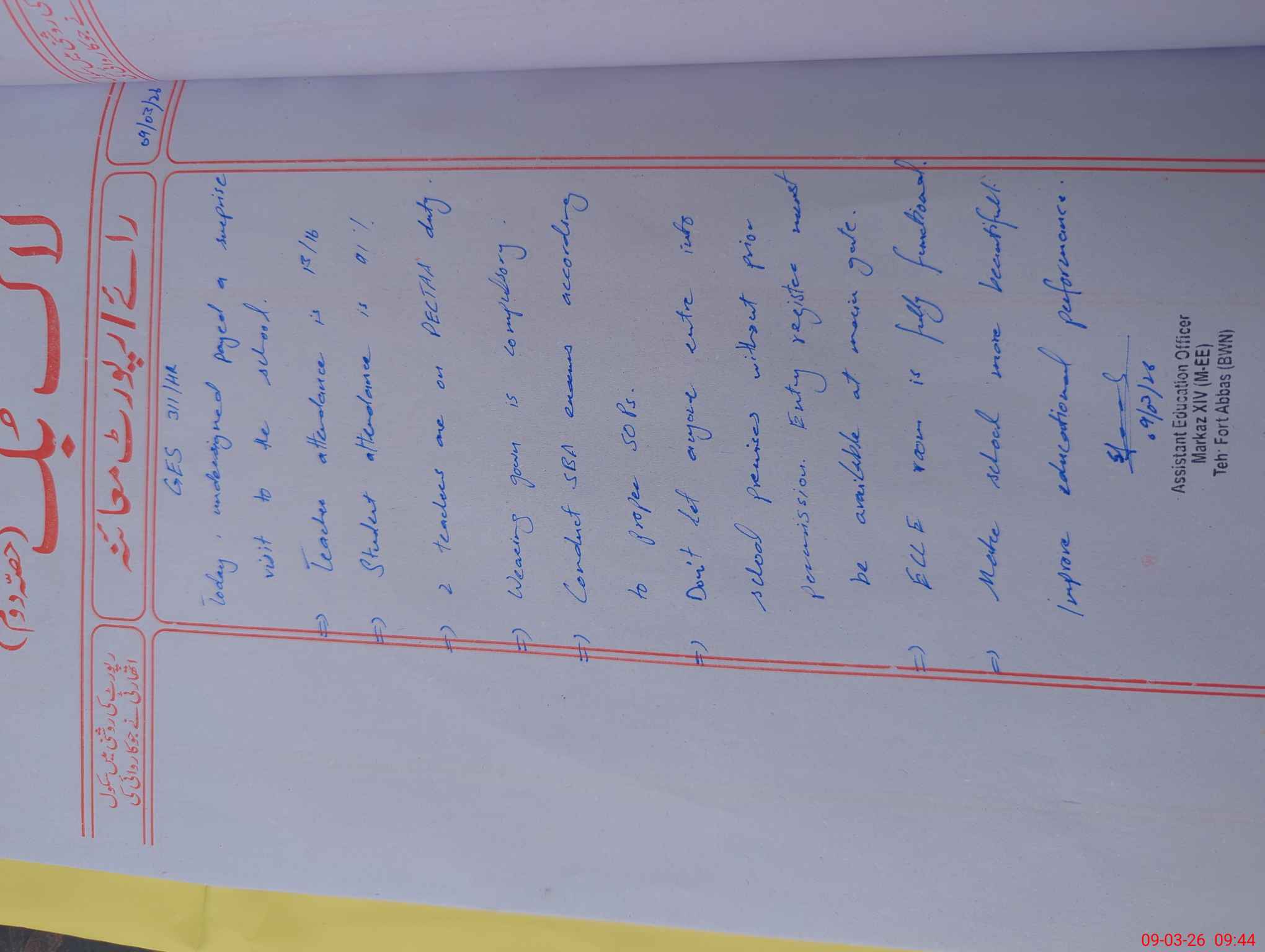 | Remarks (Use Separate Page if Required): Cleanliness is good. Educational Performance is good but required improvment | |||||