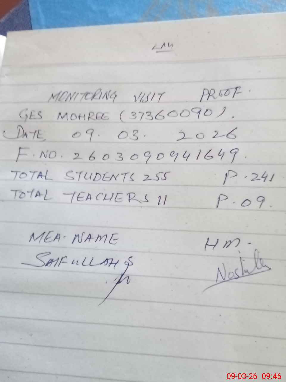 | Certified that this School was Inspected by the Undersigned MEA/DMO Today and the Information Stated Above is as Per Record. | |||||