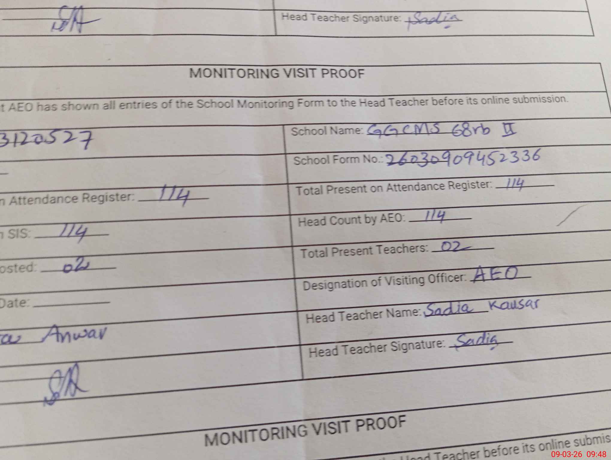 | Attendance Register | Head Teacher | MEA with School | Visit Proof |