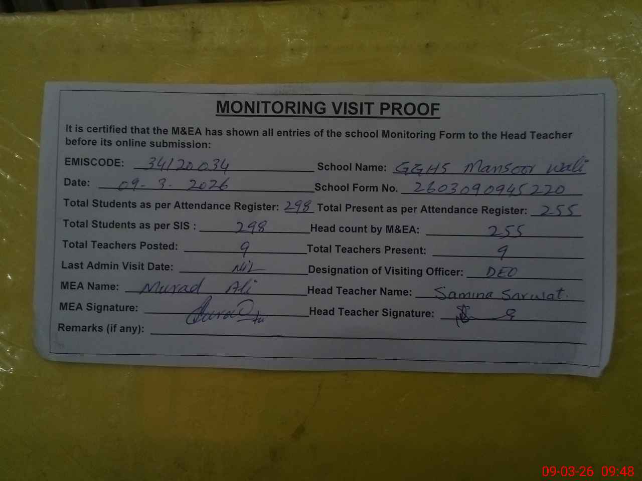 | EMIS Code: 34120034 | Name of School: GGHS MANSOOR WALI | |||