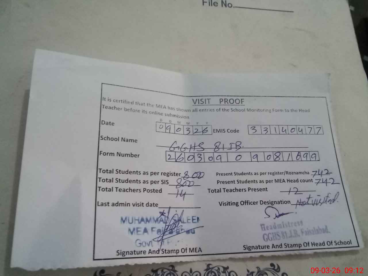 | Attendance Register | Head Teacher | MEA with School | Visit Proof |