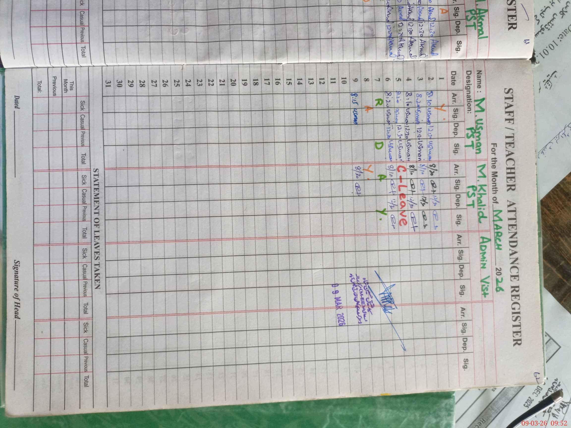 | 33**** | Ab**** Al**** | PST Arts | Regular | 0 | 0 | 0 | 0 | 0 | 0 | 0 | 0 | 0 | Exam Duty |