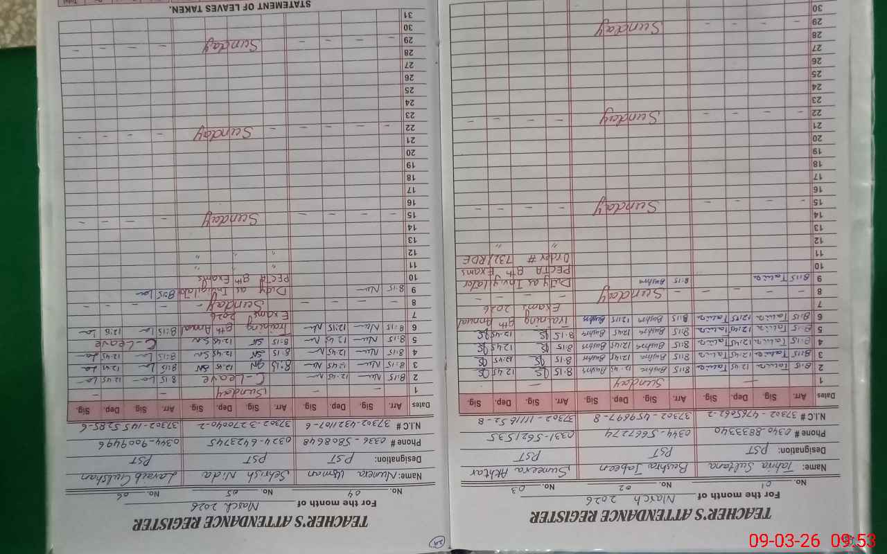 | 37**** | Su**** Ak**** | PST Arts | Regular | 1 | 0 | 0 | 0 | 0 | 0 | 0 | 0 | 1 | Exam Duty |