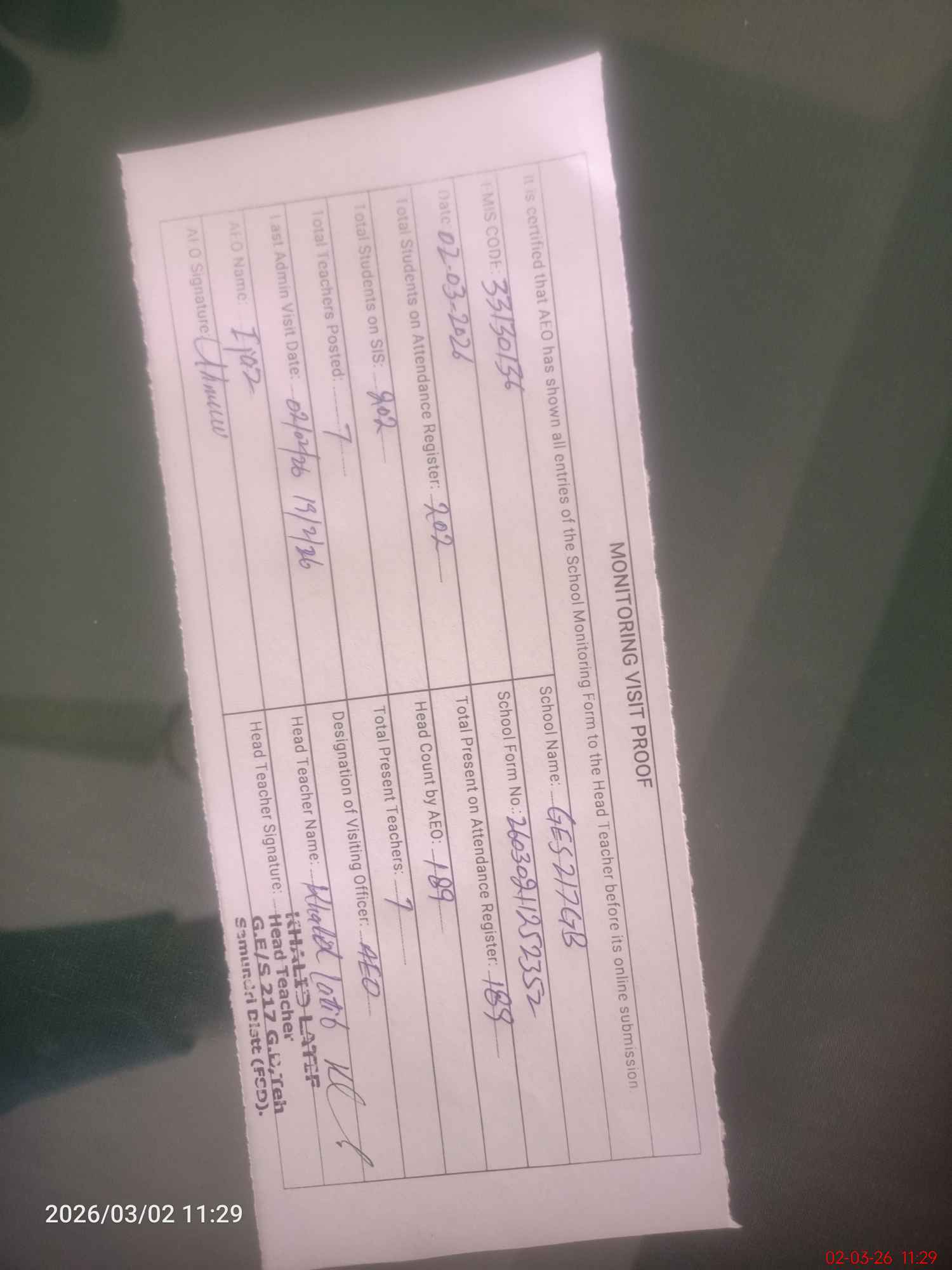 | Attendance Register | Head Teacher | MEA with School | Visit Proof |