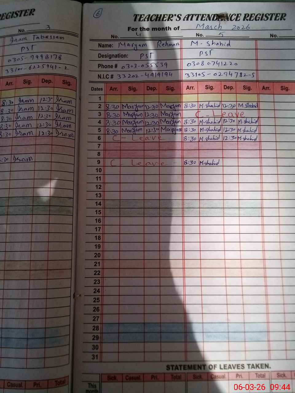 | CNIC | Full Name | Designation | R/C | Absence During Last Calender Month |