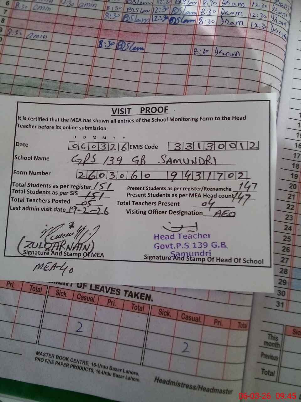 | Attendance Register | Head Teacher | MEA with School | Visit Proof |