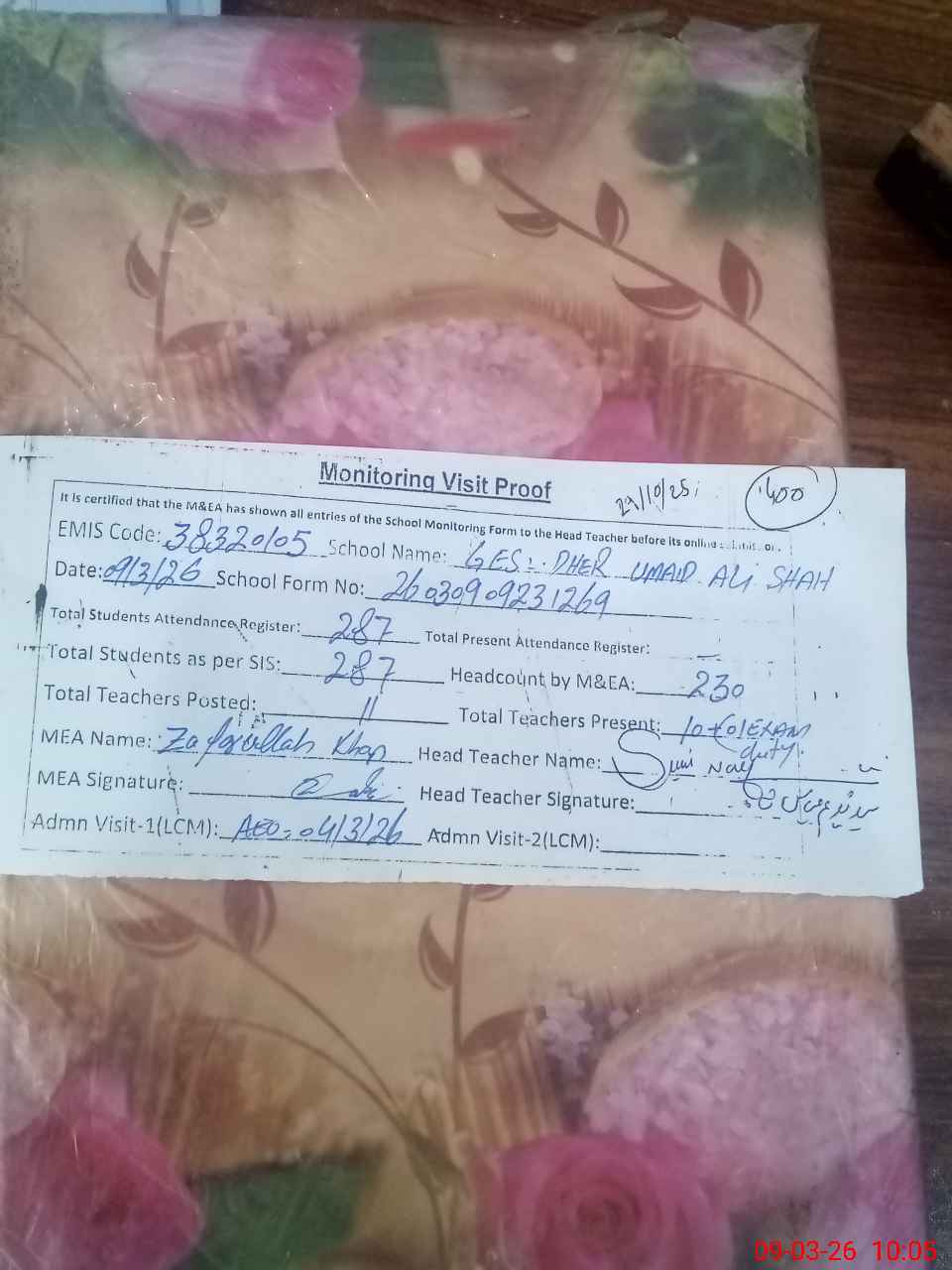 | Attendance Register | Head Teacher | MEA with School | Visit Proof |