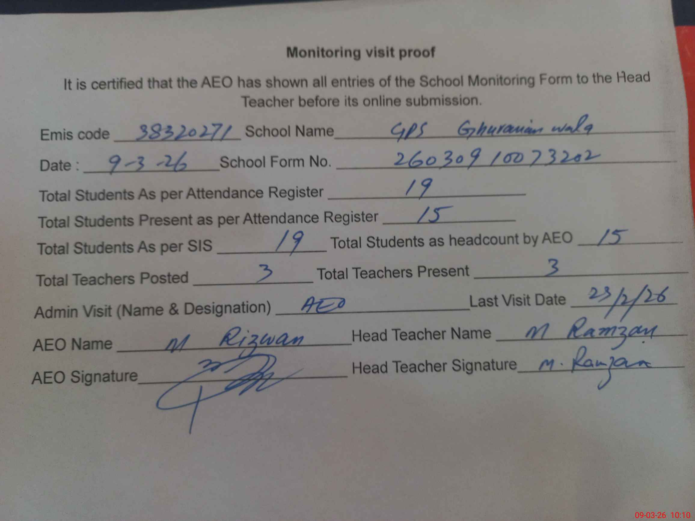 | Attendance Register | Head Teacher | MEA with School | Visit Proof |