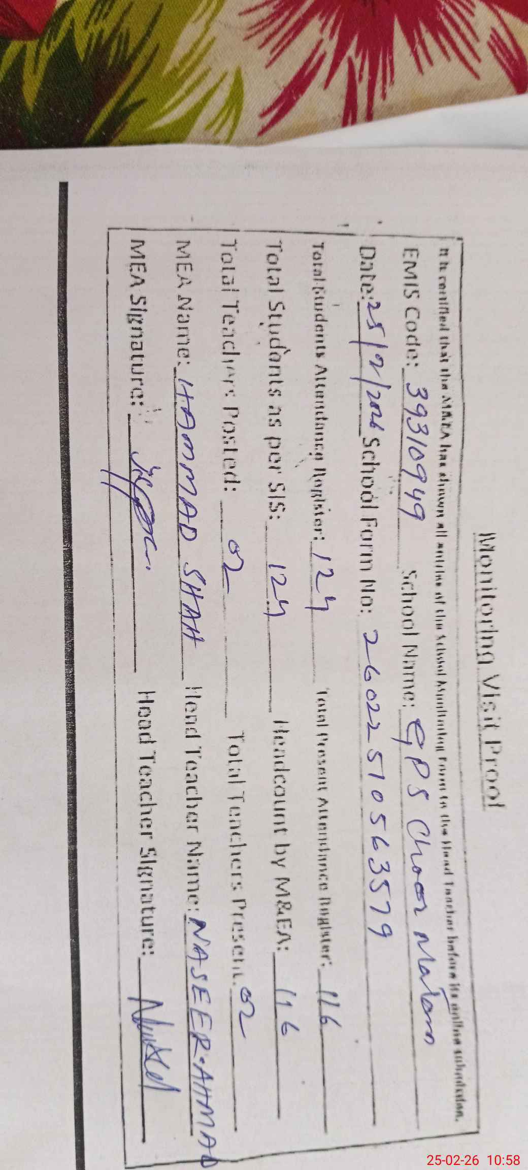 | EMIS Code: 39310949 | Name of School: GPS CHOOR MAHTAM | |||