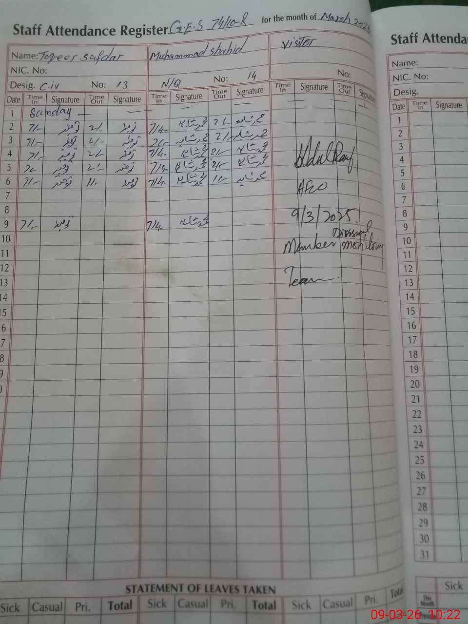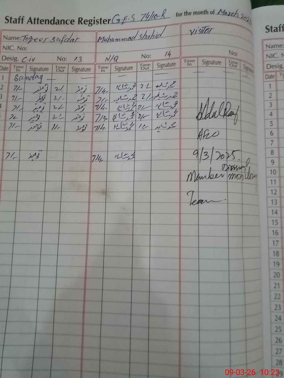 | CNIC | Full Name | Designation | R/C | Absence During Last Calender Month |