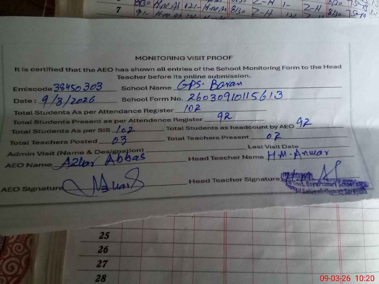 | Attendance Register | Head Teacher | MEA with School | Visit Proof |