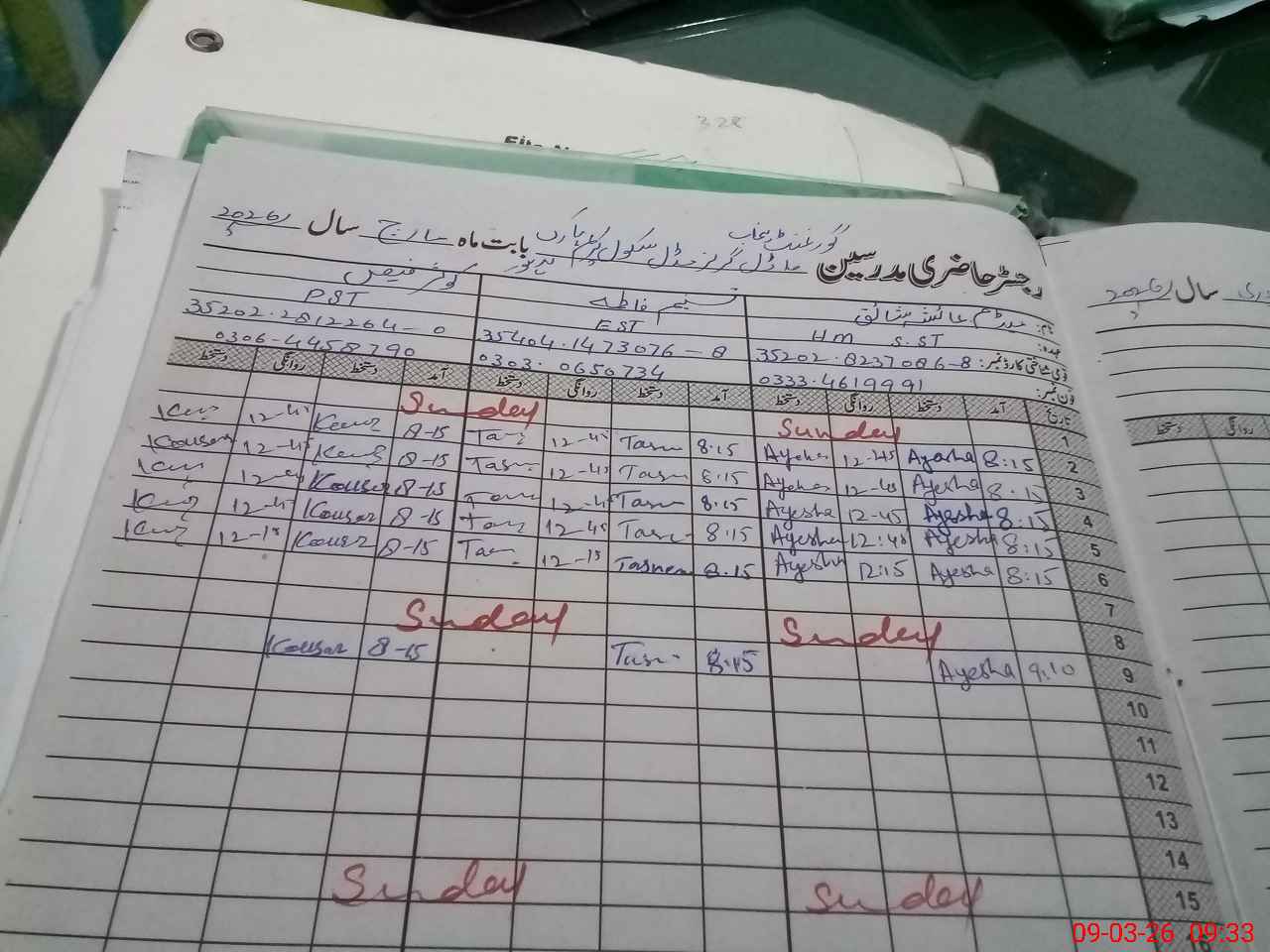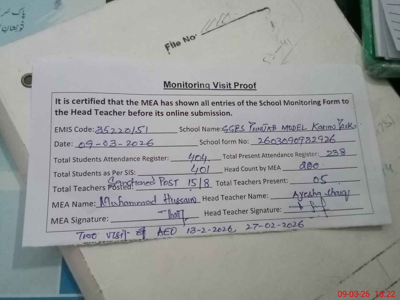 | Remarks (Use Separate Page if Required): 1 MUJEEB UR REHMAN SECURITY GUARD working in secteriate and join school about three years ago but no any joining letter in school and no any official duty letter in school no furthure order so mark him absent 2 NSB data of finicial year from July 2025 to February 2026 not up dated on SiS 3 Eighth class on annual exam total enrollment entered but present mark zero 4 ECE CLass students no paper to day and students not present in school so total enrollment entered but present mark zero 5 Zara ferdous EST and abida Aslam Est teacher not present in school and both teachers attendence colum blank as per monitoring sop mark absent from duty | |||||