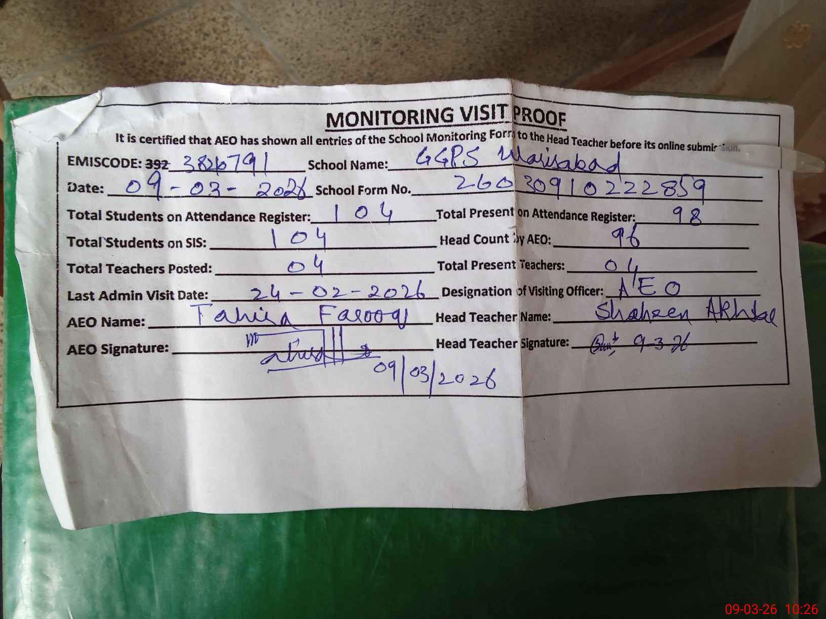 | Attendance Register | Head Teacher | MEA with School | Visit Proof |