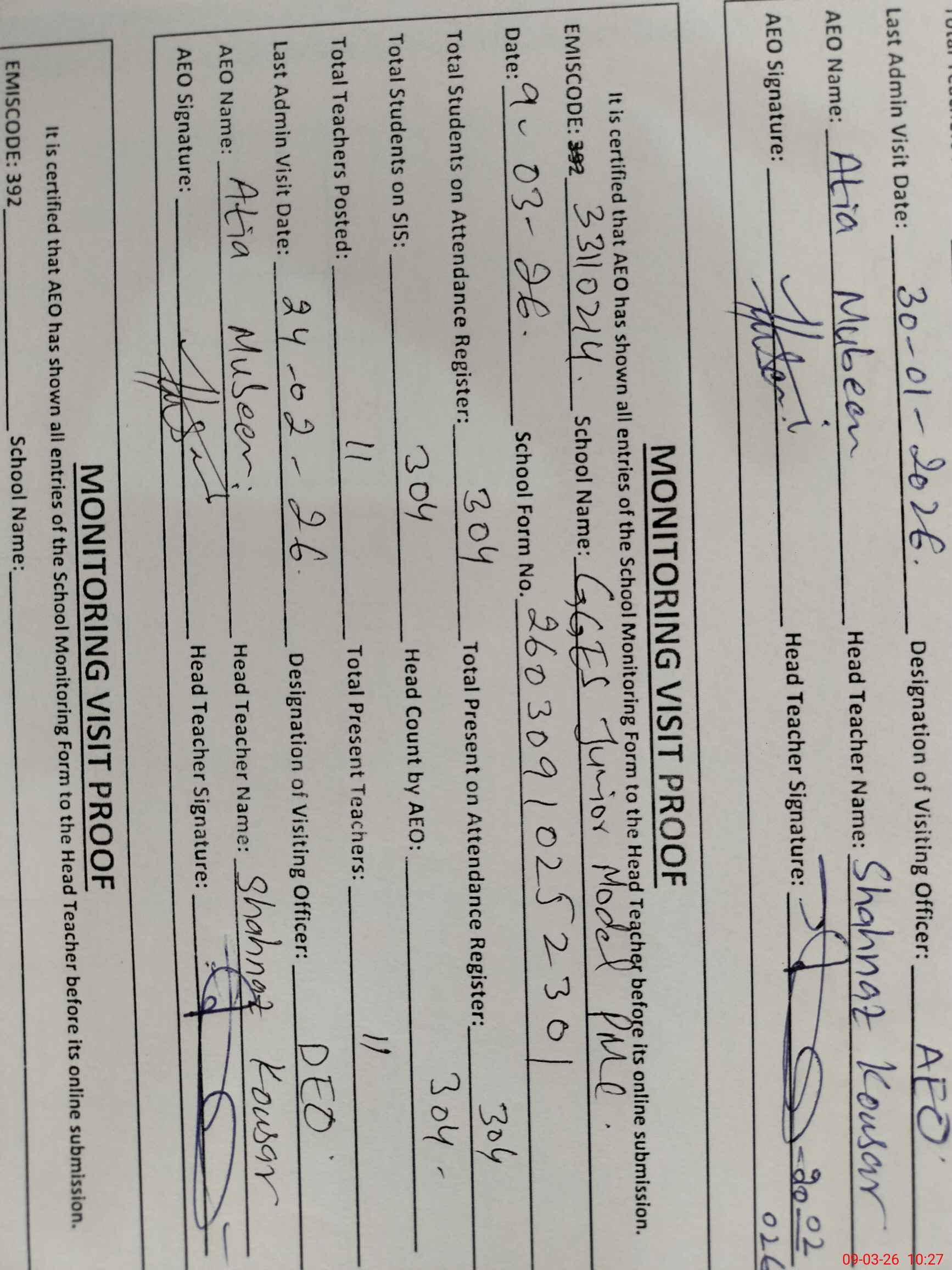 | Certified that this School was Inspected by the Undersigned MEA/DMO Today and the Information Stated Above is as Per Record. | |||||