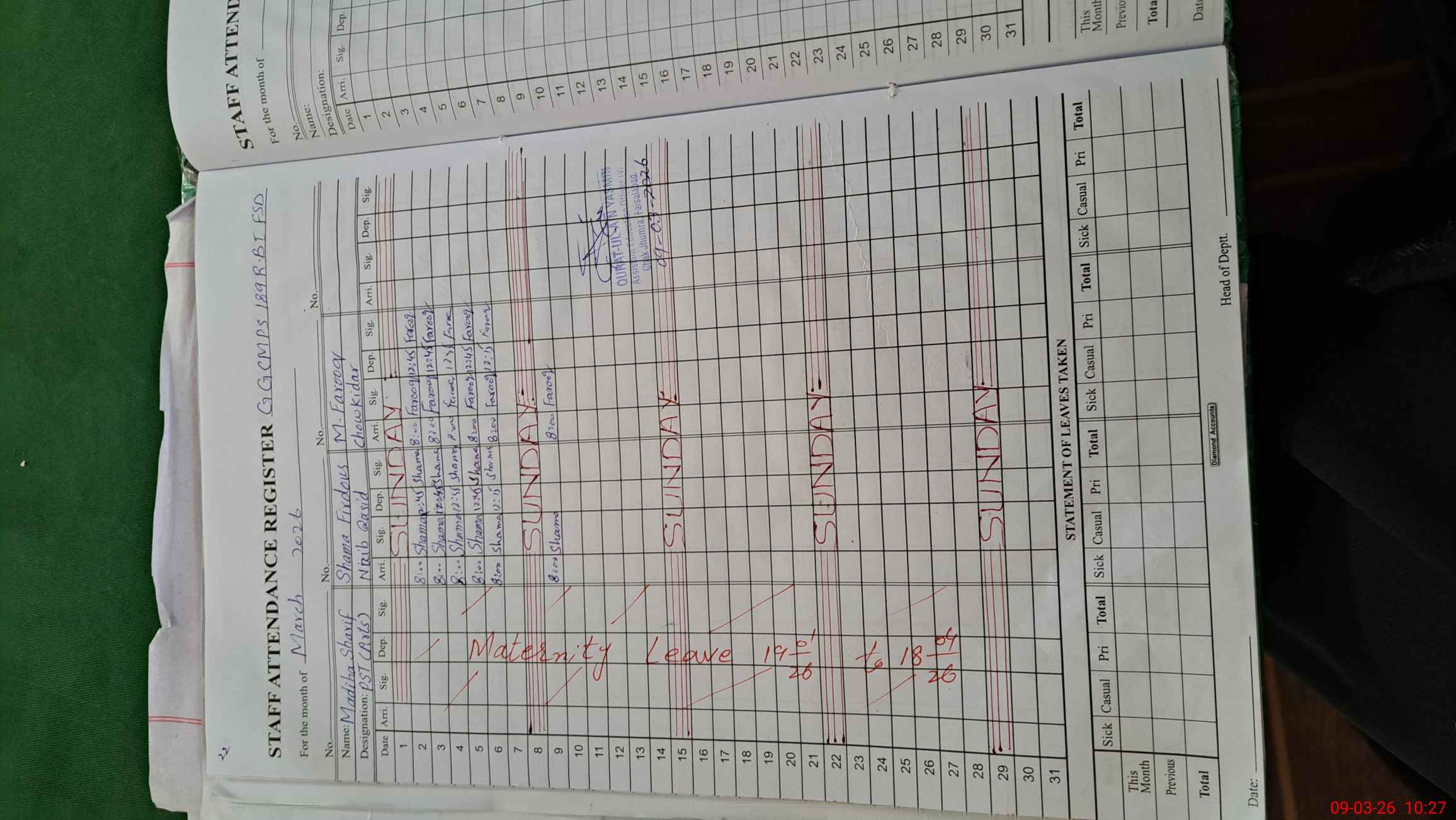 | 33**** | Ma**** Sh**** | PST Arts | Regular | 0 | 0 | 0 | 0 | 0 | 0 | 0 | 0 | 0 | Maternity |