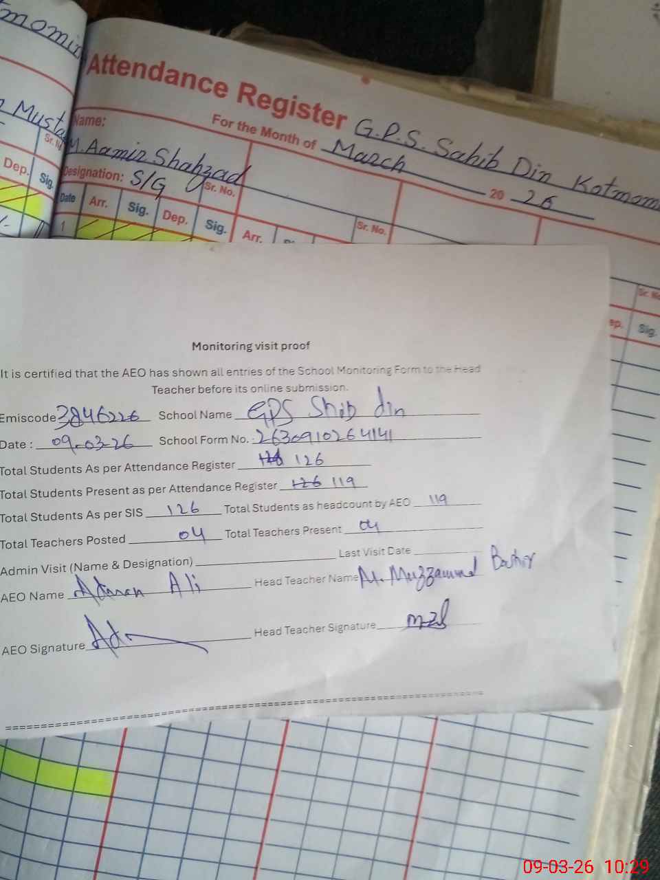 | Attendance Register | Head Teacher | MEA with School | Visit Proof |