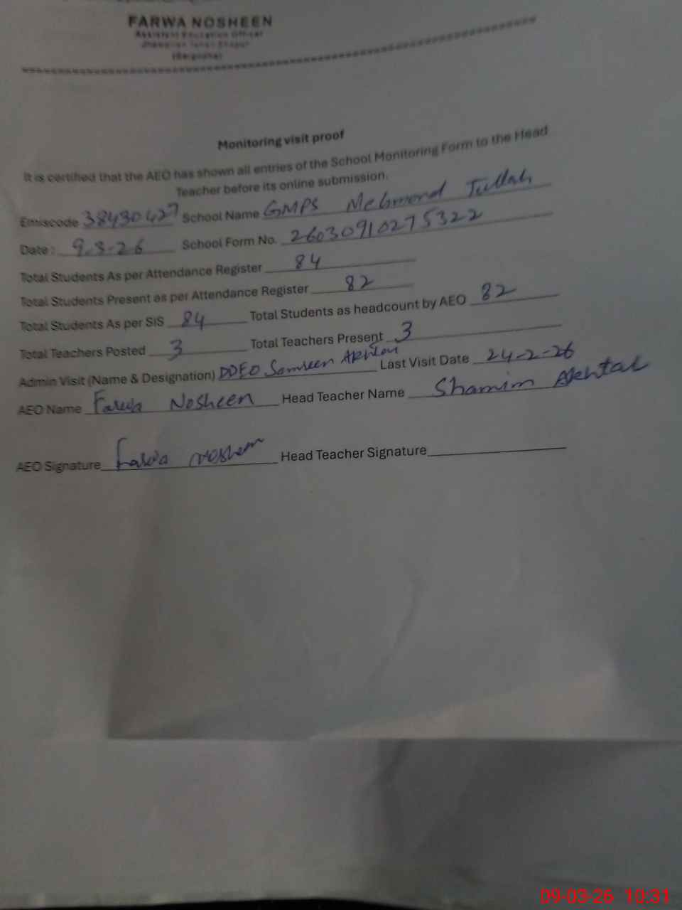 | Attendance Register | Head Teacher | MEA with School | Visit Proof |