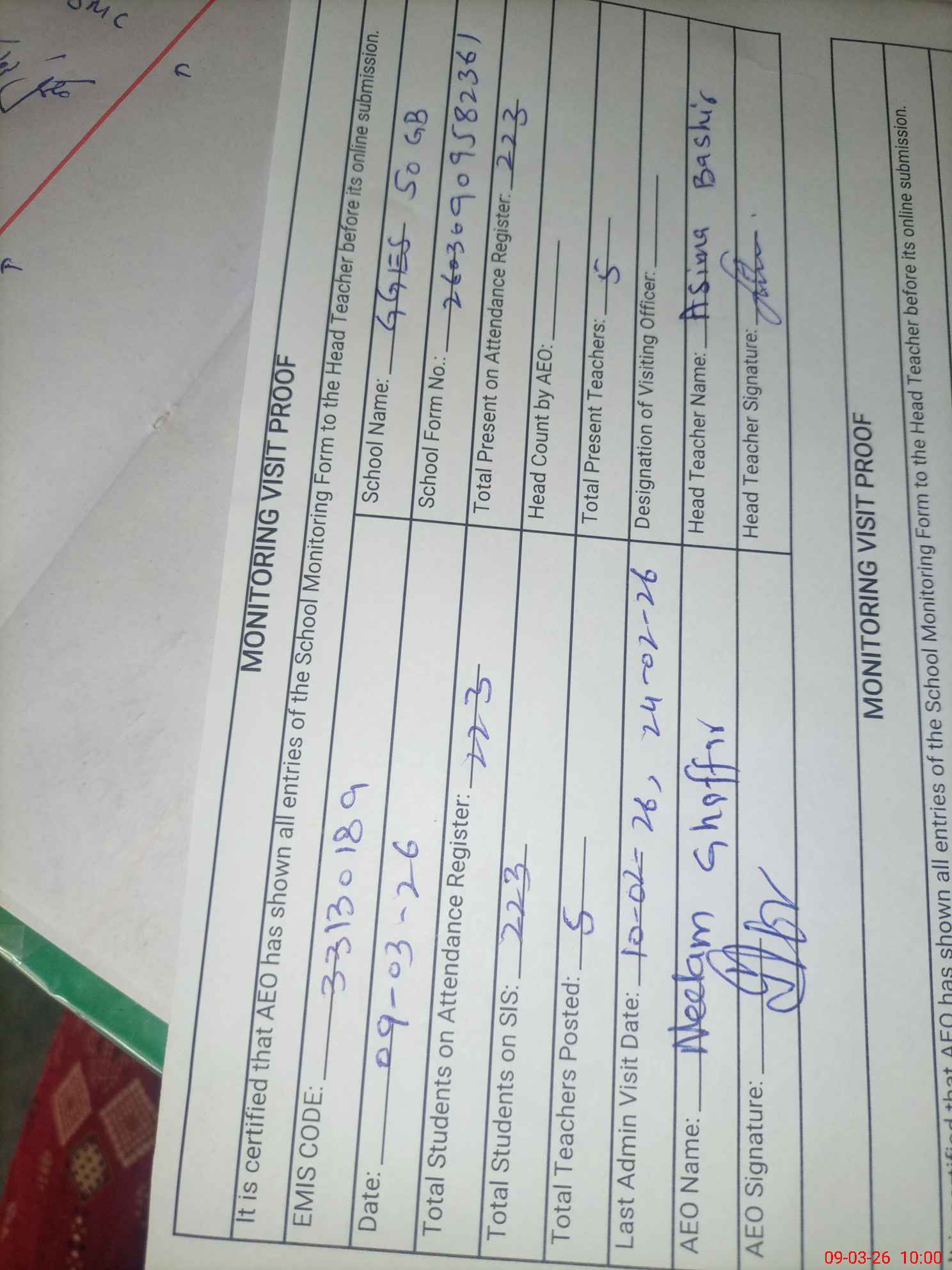 | Attendance Register | Head Teacher | MEA with School | Visit Proof |