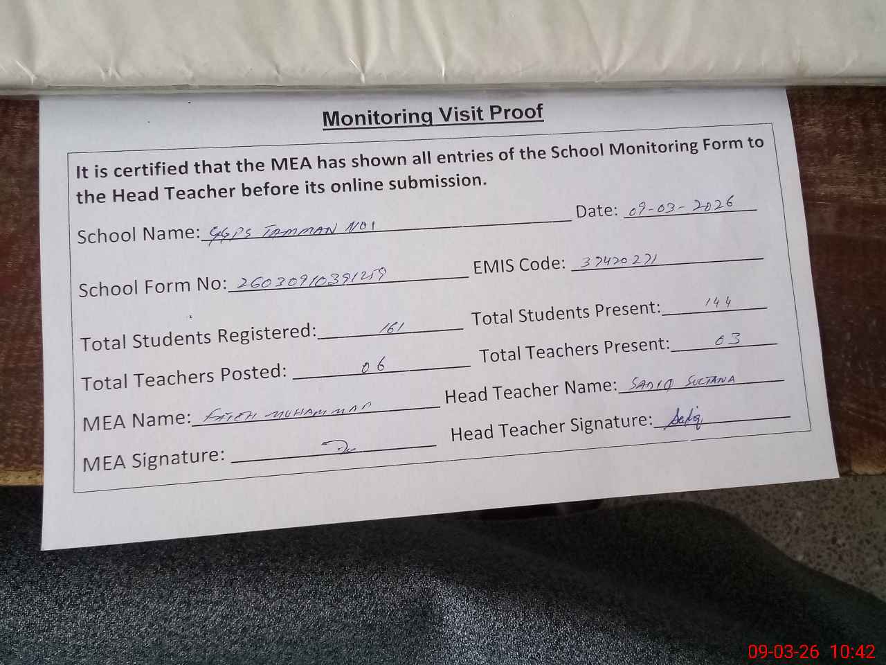 | Monitoring Date: 09-03-2026 | Start Time: 09-03-2026 10:17 AM | End Time: 09-03-2026 10:45 AM | Name of MEA: Fa**** Mu**** | |