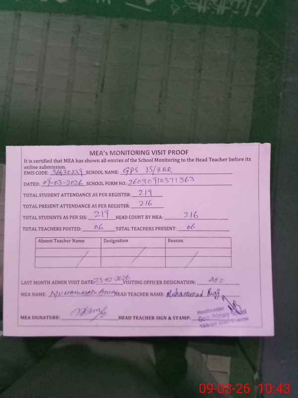 | EMIS Code: 36430239 | Name of School: GPS 15/8-BR, TULAMBA | |||