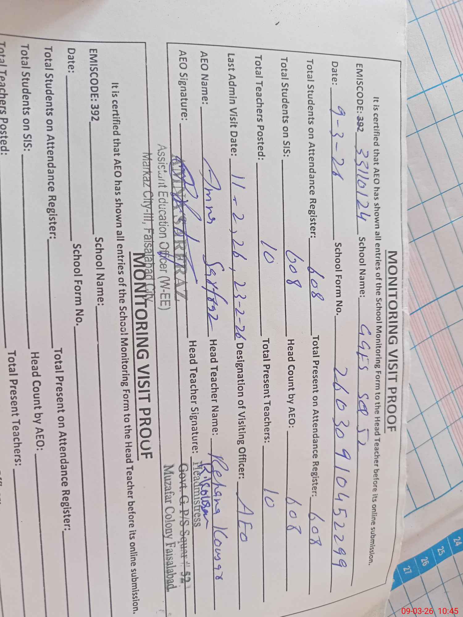 | Attendance Register | Head Teacher | MEA with School | Visit Proof |