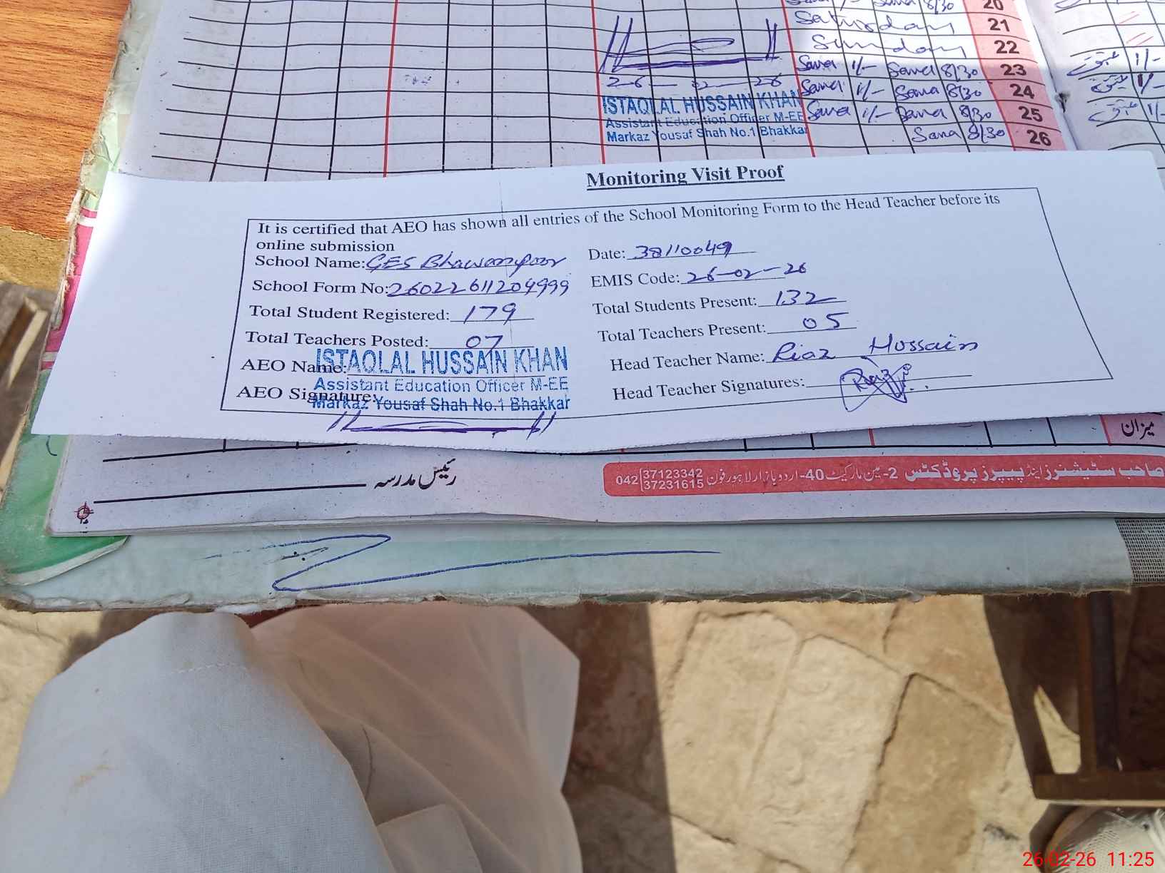 | Attendance Register | Head Teacher | MEA with School | Visit Proof |