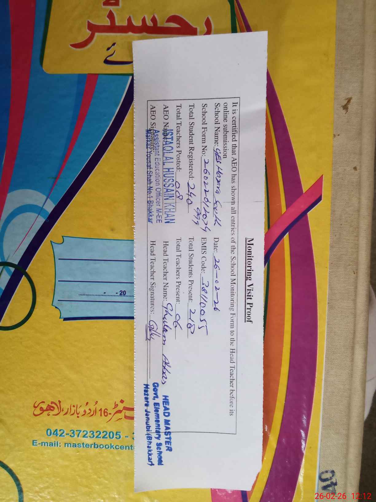 | Attendance Register | Head Teacher | MEA with School | Visit Proof |
