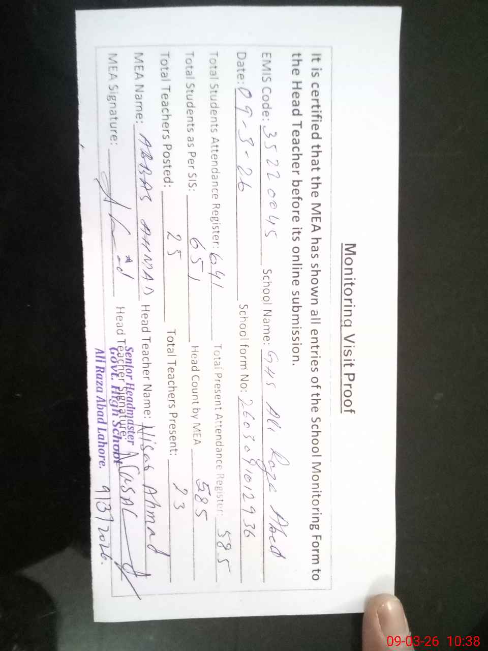 | Attendance Register | Head Teacher | MEA with School | Visit Proof |