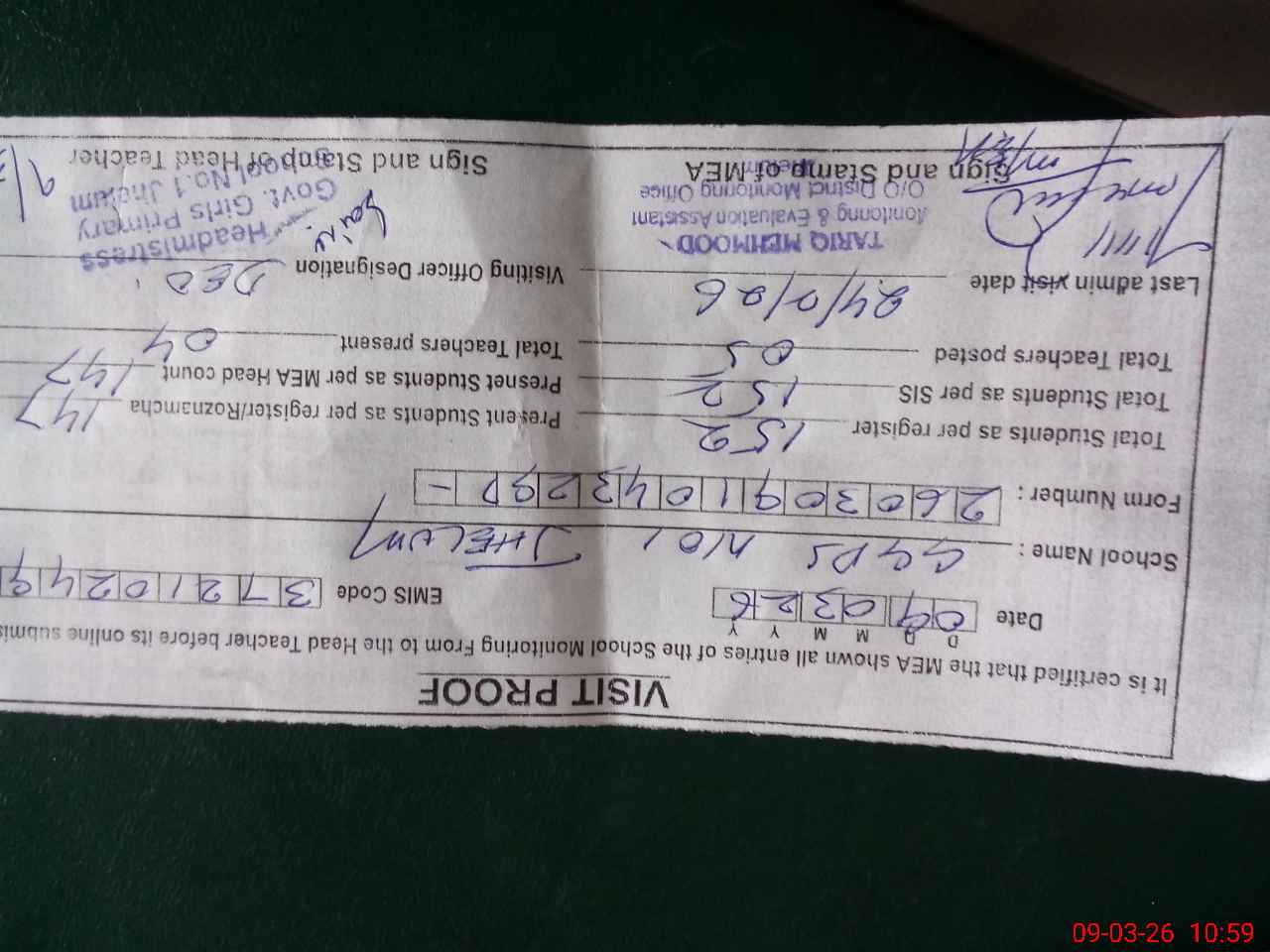 | Certified that this School was Inspected by the Undersigned MEA/DMO Today and the Information Stated Above is as Per Record. | |||||